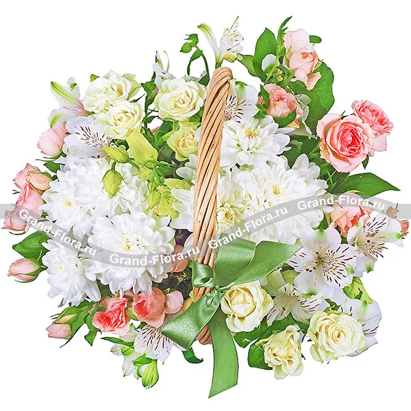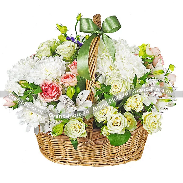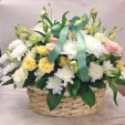 (на фото): хризантема кустовая белая - 2 шт., роза кустовая белая - 2 шт., роза кустовая розовая - 3 шт., эустома белая - 1 шт., альстромерия белая - 3 шт., декоративная зелень, оазис, корзина средняя.