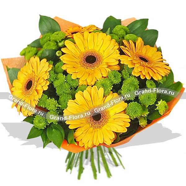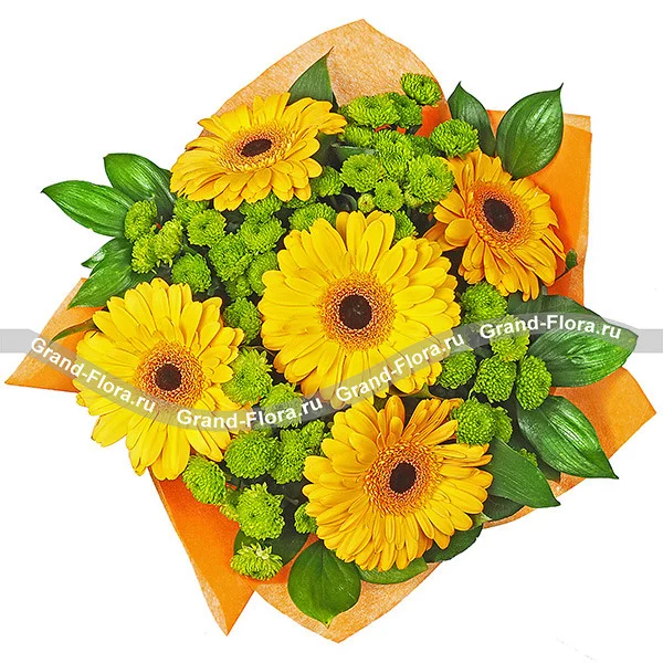 Попасть в объятия к солнцу и окружить любимую теплотой теперь еще проще! Достаточно заказать на сайте этот потрясающий по красоте букет, от которого веет положительными эмоциями. Роскошные желтые садовые герберы и миниатюрные головки зеленых хризантем составляют достойный дуэт красок. Букет понравится жизнерадостным девушкам и женщинам, он привнесет в их жизнь частичку праздника, жаркого лета и мирного солнца.